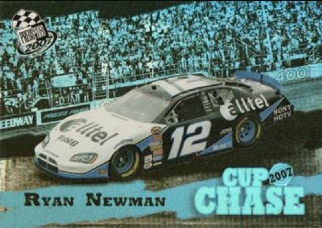 The Ryan Newman 2007 Press Pass #CCR-6 Cup Chase card is 1 of 15 Ryan Newman's card variations in the 2007 Press Pass set being tracked by Sports Card Investor, including Base, Blue, Gold, Platinum /100, and eBay Previews /5.