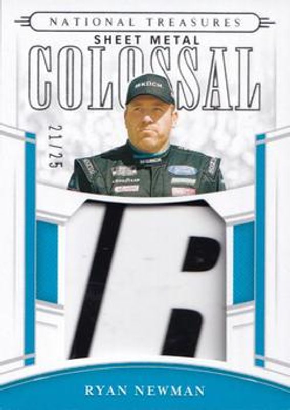 The Ryan Newman 2020 National Treasures NASCAR #CRU-RN Colossal Race Used Sheet Metal /25 card is 1 of 95 Ryan Newman's card variations in the 2020 National Treasures NASCAR set being tracked by Sports Card Investor, including #43 Base /25, #5 Base /25, #87 Base /25, #5 Holo Silver /15, and #87 Holo Silver /15.