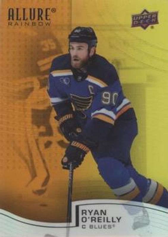 The Ryan O'Reilly 2021 Upper Deck Allure #R-90 Rainbow Orange - Yellow card is 1 of 43 Ryan O'Reilly's card variations in the 2021 Upper Deck Allure set being tracked by Sports Card Investor, including Base, Black Rainbow, Blue China, Orange Slice die-cut, and Pink Blue Leopard.