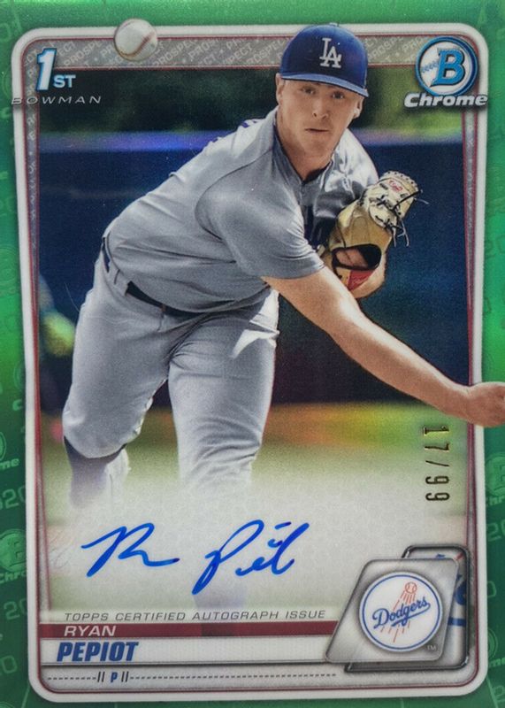 The Ryan Pepiot 2020 Bowman Chrome #CPA-RPE Prospect Auto - Green Refractor /99 (1st) card in Raw condition has not changed in price in the last 30 days and was last sold for $19.99 .