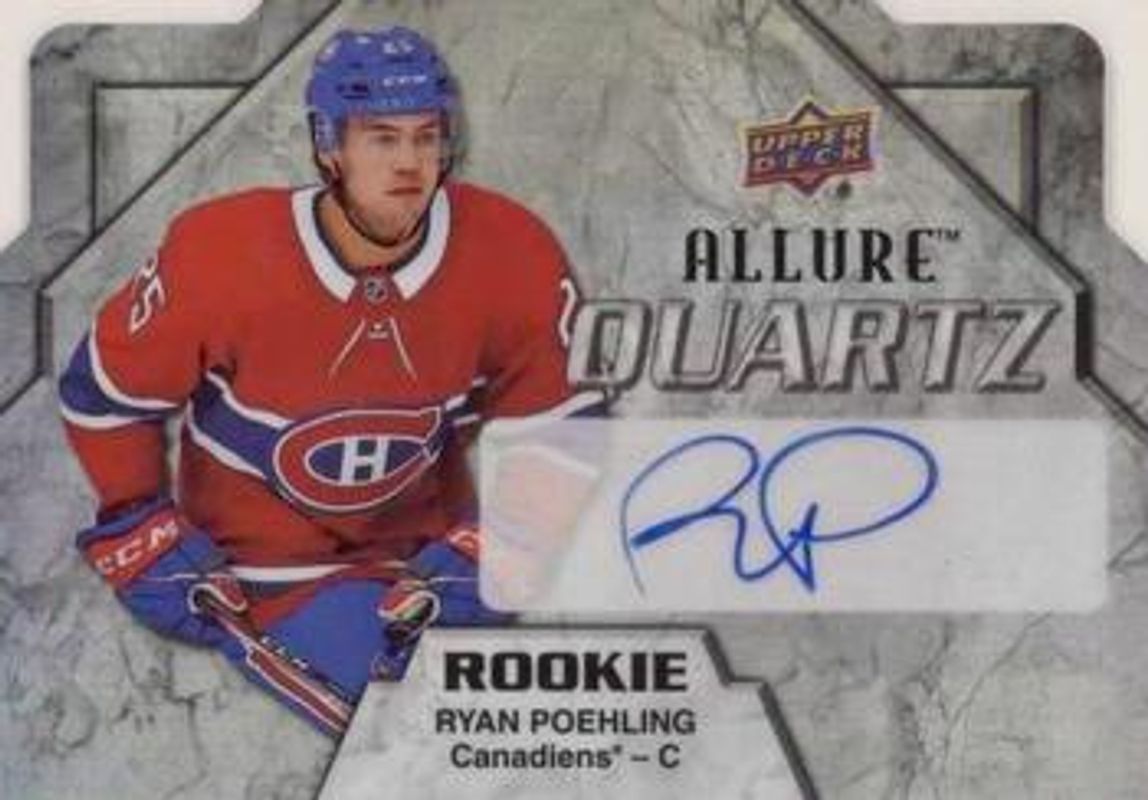 The Ryan Poehling 2019 Upper Deck Allure #AQR-RP Quartz Rookie Autographs card is 1 of 44 Ryan Poehling's card variations in the 2019 Upper Deck Allure set being tracked by Sports Card Investor, including #104 Base, #86 Base, #86 Pewter, #104 Pink Diamond, and #86 Red Rainbow.