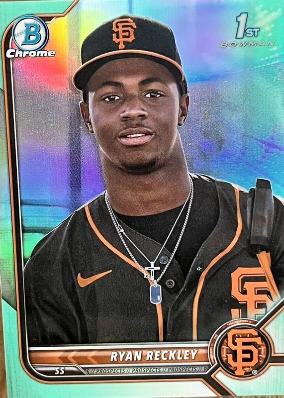 This card is 1 of 47 Ryan Reckley's card variations in the 2022 Bowman Chrome set being tracked by Sports Card Investor, including Prospects (1st), Prospects - Black & White Mini-Diamond Refractor (1st), Prospects - Shimmer Refractor (1st), Prospects - Refractor /499 (1st), and Prospects - Speckle Refractor /299 (1st).
