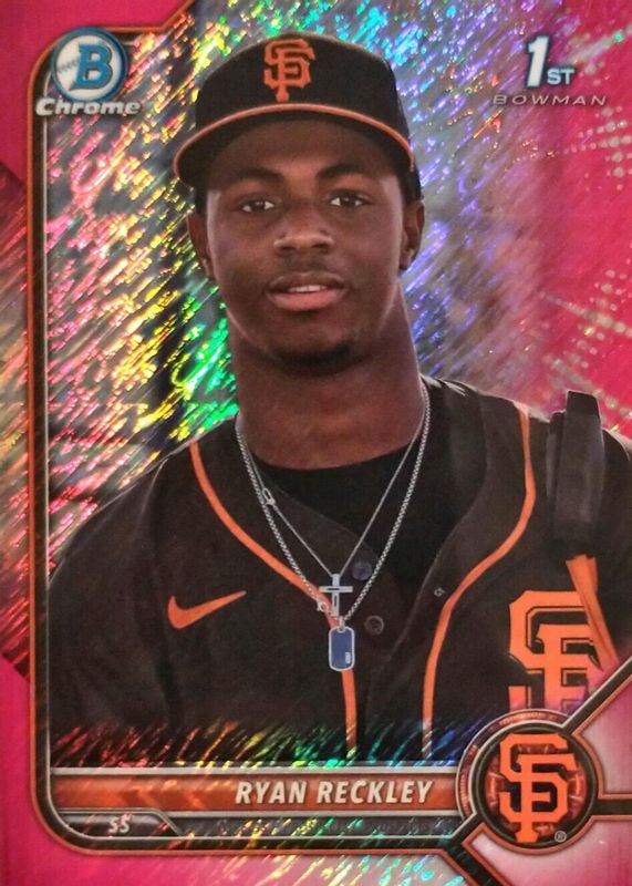 The Ryan Reckley 2022 Bowman Chrome #BCP-163 Prospects - Fuchsia Shimmer Refractor /199 (1st) card in Raw condition has not changed in price in the last 30 days and was last sold for $9.99 .