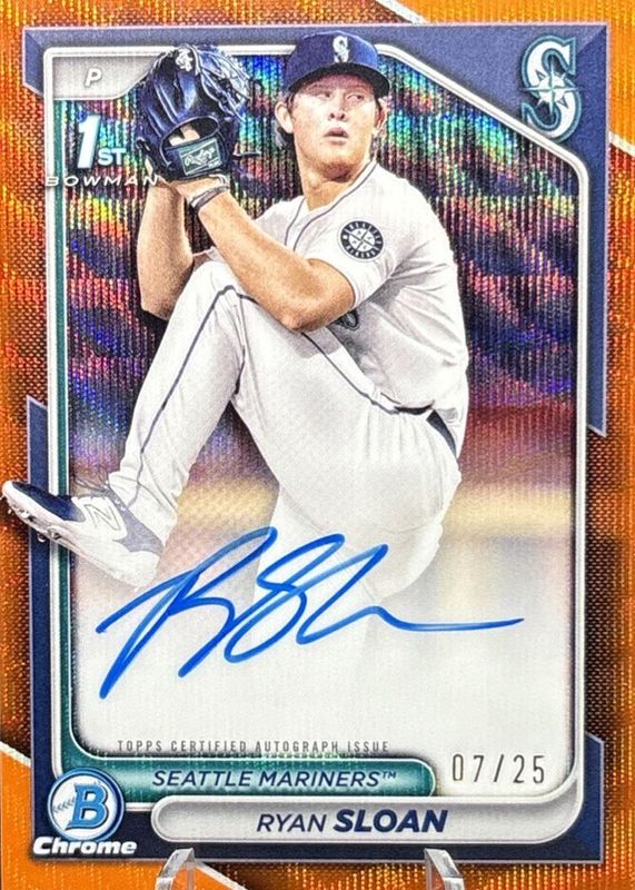 The Ryan Sloan 2024 Bowman Draft #CPA-RS Chrome DP Auto - Orange Wave Refractor /25 (1st) card in Raw condition has not changed in price in the last 30 days and was last sold for $278.00 .