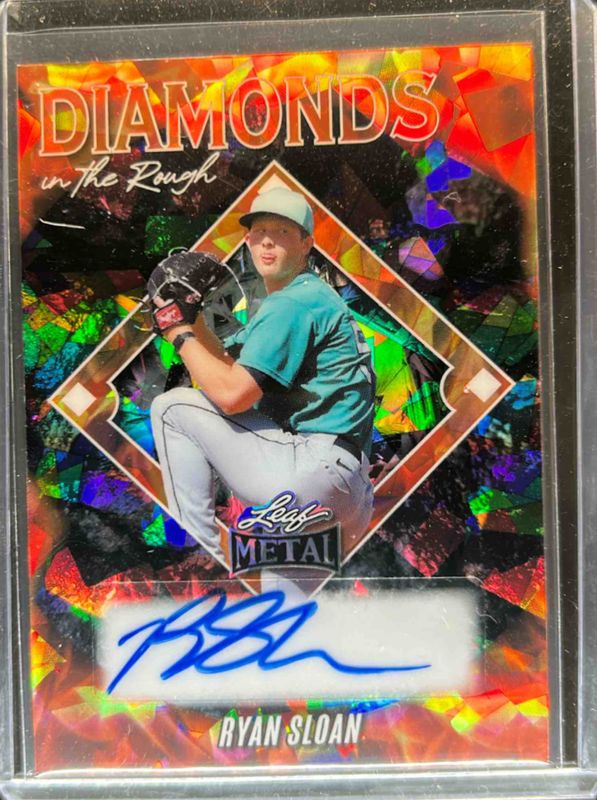 The Ryan Sloan 2025 Leaf Metal #DR-RS2 Diamond in the Rough Autographs - Crystal Fire /1 card is 1 of 140 Ryan Sloan's card variations in the 2025 Leaf Metal set being tracked by Sports Card Investor, including Base Set - Lite Brite Silver /99, 92 Leaf LGR - Lite Brite Silver /49, Base Autographs - Lite Brite Silver /49, Base Set - Prismatic Blue /49, and Diamond in the Rough Autographs - Lite Brite Silver /49.