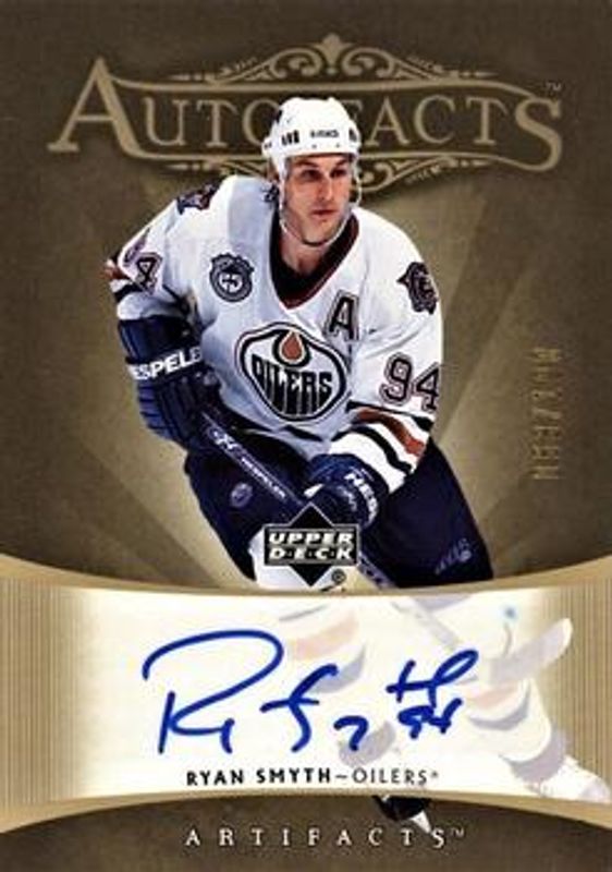 The Ryan Smyth 2005 Upper Deck Artifacts #AF-RS Auto Facts /100 card is 1 of 34 Ryan Smyth's card variations in the 2005 Upper Deck Artifacts set being tracked by Sports Card Investor, including Base /750, Pewter /100, Blue /75, Red /50, and Green /25.