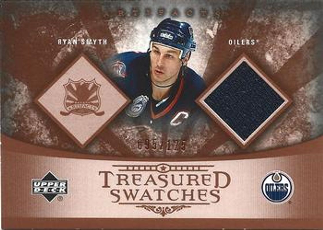 The Ryan Smyth 2005 Upper Deck Artifacts #TS-RS Treasured Swatches Copper /125 card is 1 of 34 Ryan Smyth's card variations in the 2005 Upper Deck Artifacts set being tracked by Sports Card Investor, including Base /750, Pewter /100, Blue /75, Red /50, and Green /25.