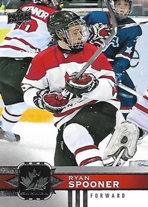 The Ryan Spooner 2017 Upper Deck Team Canada #48 Base card is 1 of 8 Ryan Spooner's card variations in the 2017 Upper Deck Team Canada set being tracked by Sports Card Investor, including UD Exclusives Silver /100, UD Exclusives Gold /10, Black Foil Signatures /5, Printing Plates Black /1, and Printing Plates Cyan /1.