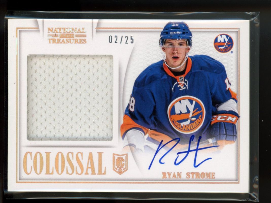 The Ryan Strome 2013 National Treasures #CO-RS Colossal Jerseys Autographs /25 Rookie card is 1 of 30 Ryan Strome's card variations in the 2013 National Treasures set being tracked by Sports Card Investor, including Base /99, Rainbow /21, Phenoms Autographs, Rookie Jumbo Jerseys Booklet Autographs /99, and Rookie Timeline Jerseys /99.