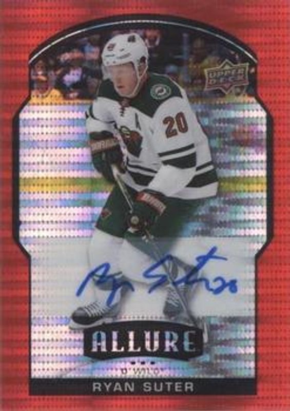The Ryan Suter 2020 Upper Deck Allure #15 Red Rainbow Autographs /299 card is 1 of 31 Ryan Suter's card variations in the 2020 Upper Deck Allure set being tracked by Sports Card Investor, including Base, 2005 Shield, Black Rainbow, Blue China, and Leopard.