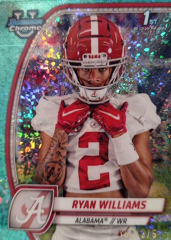 This card is 1 of 43 Ryan Williams' card variations in the 2024 Bowman Chrome University set being tracked by Sports Card Investor, including Base (1st), Pink Lava Refractor (1st), Purple Shimmer Refractor (1st), Refractor (1st), and Stealth Refractor (1st).