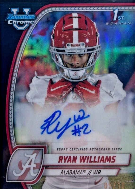 This card is 1 of 43 Ryan Williams' card variations in the 2024 Bowman Chrome University set being tracked by Sports Card Investor, including Base (1st), Pink Lava Refractor (1st), Purple Shimmer Refractor (1st), Refractor (1st), and Stealth Refractor (1st).