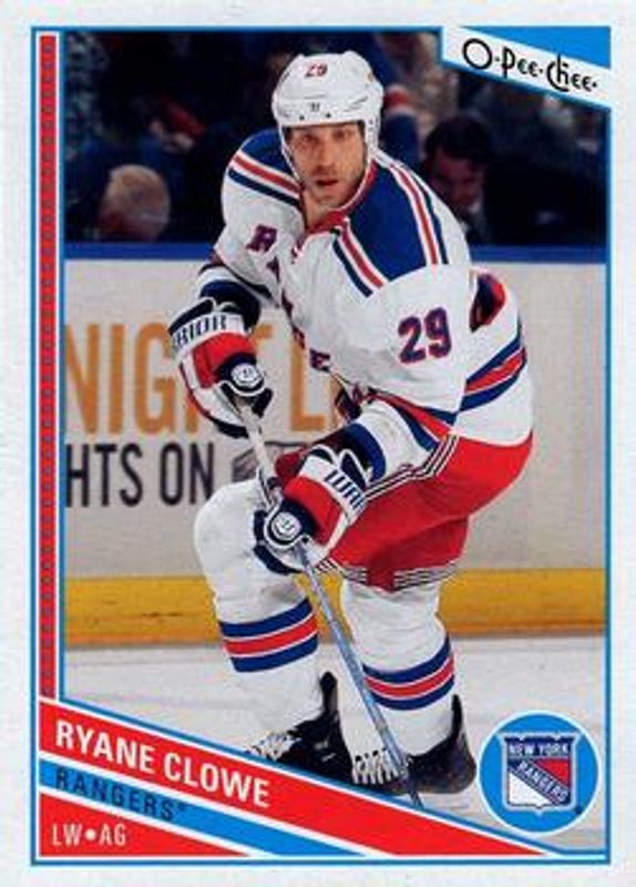 The Ryane Clowe 2013 O-Pee-Chee #42 Base card is 1 of 6 Ryane Clowe's card variations in the 2013 O-Pee-Chee set being tracked by Sports Card Investor, including Rainbow, Red, Retro, Retro Blank Back, and Black Rainbow /100.