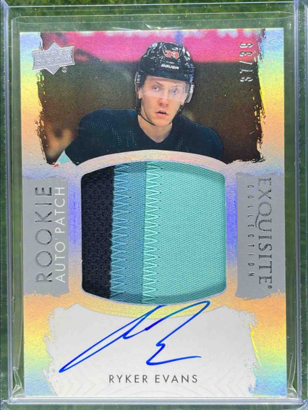 The Ryker Evans 2023 Upper Deck The Cup #EC-RE 2023 Exquisite Collection Rookie - Auto Patch /7 card is 1 of 32 Ryker Evans' card variations in the 2023 Upper Deck The Cup set being tracked by Sports Card Investor, including Base /249, Gold Foil /24, Gold Spectrum Foil /24, Red Foil /4, and Green Foil /3.