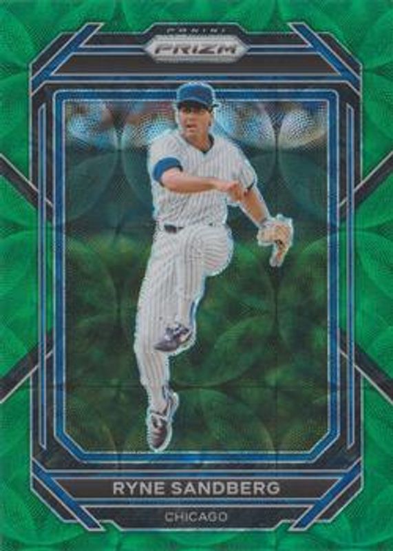 The Ryne Sandberg 2023 Prizm #111 Green Scope /75 card is 1 of 32 Ryne Sandberg's card variations in the 2023 Prizm set being tracked by Sports Card Investor, including Base, Blue Ice, Giraffe, Green Ice, and Hyper.