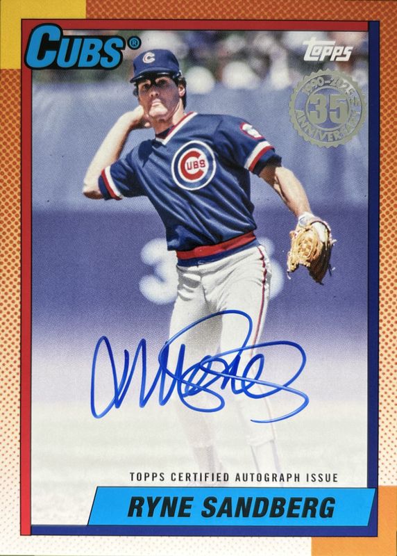 The Ryne Sandberg 2025 Topps #90AU-RS 1990 Baseball Autographs (Series 1) card is 1 of 49 Ryne Sandberg's card variations in the 2025 Topps set being tracked by Sports Card Investor, including 1990 Topps Baseball, 1990 Topps Baseball - Pink, 1990 Baseball All-Star Autographs (Series 2), 1990 Baseball Chrome Silver Pack, and 1990 Baseball Chrome Silver Pack Autographs (Series 1).