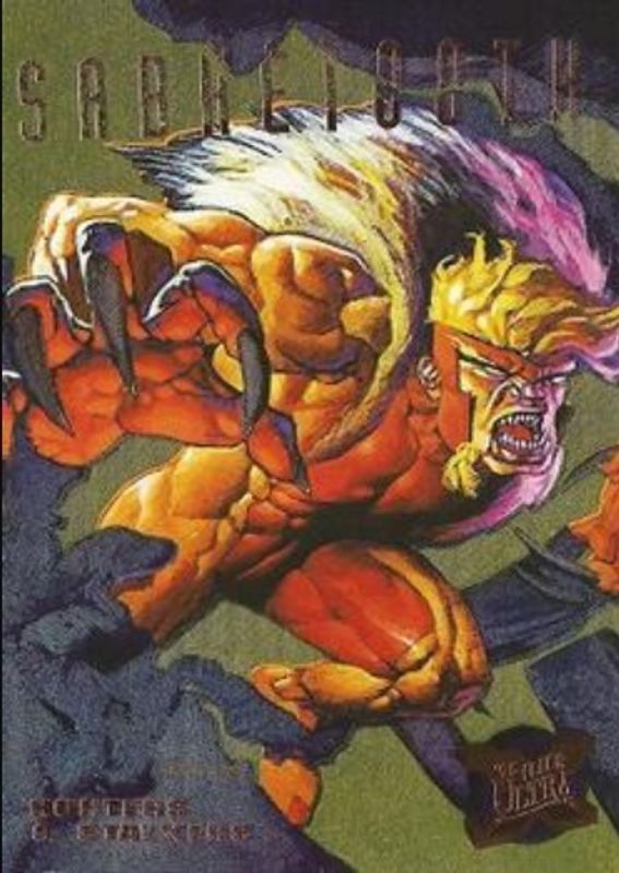 The Sabretooth 1995 Fleer Ultra X-Men #6 Hunters & Stalkers Gold card is 1 of 5 Sabretooth's card variations in the 1995 Fleer Ultra X-Men set being tracked by Sports Card Investor, including #41 Base, #63 Base, #6 Hunters & Stalkers Rainbow, and #6 Hunters & Stalkers Silver.