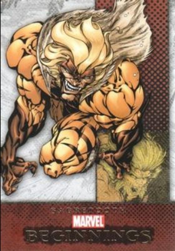 The Sabretooth 2011 Upper Deck Marvel Beginnings Series 1 #62 Base card is 1 of 7 Sabretooth's card variations in the 2011 Upper Deck Marvel Beginnings Series 1 set being tracked by Sports Card Investor, including Printing Plates Black /1, Printing Plates Cyan /1, Printing Plates Magenta /1, Printing Plates Yellow /1, and Marvel Prime Micromotion Foil.
