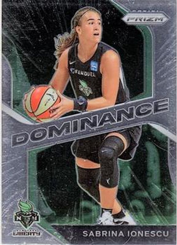 The Sabrina Ionescu 2021 Prizm WNBA #6 Dominance card is 1 of 79 Sabrina Ionescu's card variations in the 2021 Prizm WNBA set being tracked by Sports Card Investor, including Base, Green, Green Ice, Hyper, and Ice.