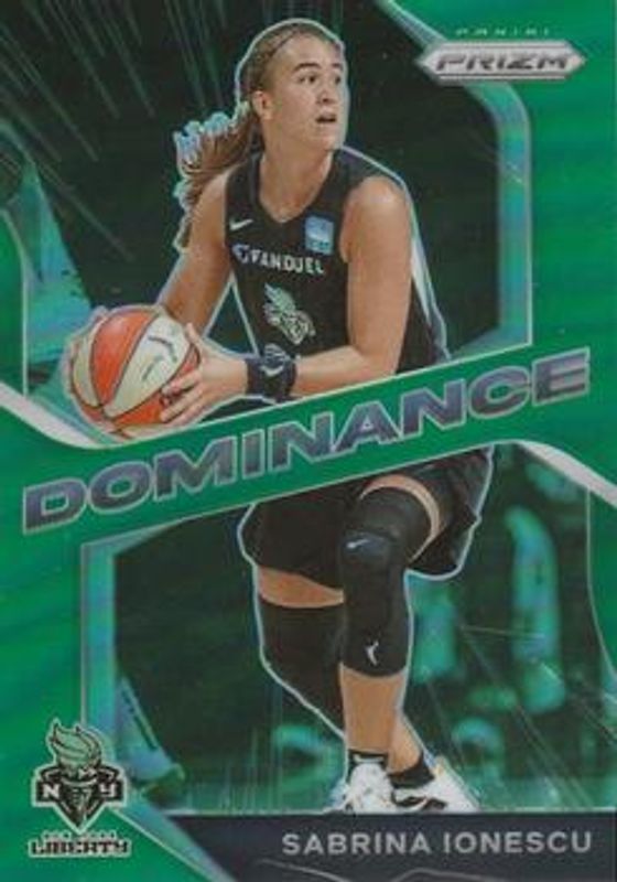 The Sabrina Ionescu 2021 Prizm WNBA #6 Dominance - Green card is 1 of 79 Sabrina Ionescu's card variations in the 2021 Prizm WNBA set being tracked by Sports Card Investor, including Base, Green, Green Ice, Hyper, and Ice.