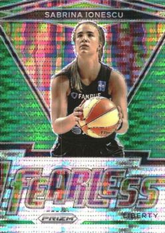 The Sabrina Ionescu 2021 Prizm WNBA #20 Fearless - Green Pulsar /25 card is 1 of 79 Sabrina Ionescu's card variations in the 2021 Prizm WNBA set being tracked by Sports Card Investor, including Base, Green, Green Ice, Hyper, and Ice.