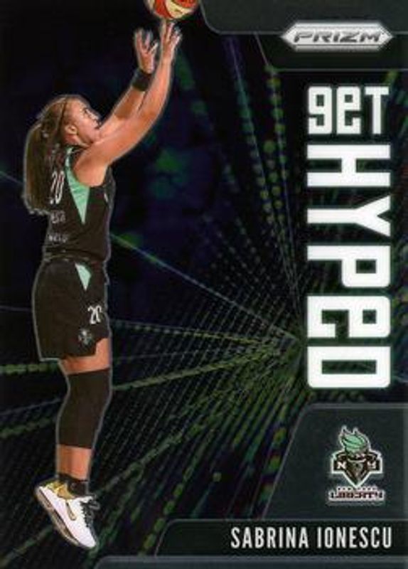 The Sabrina Ionescu 2021 Prizm WNBA #11 Get Hyped card is 1 of 79 Sabrina Ionescu's card variations in the 2021 Prizm WNBA set being tracked by Sports Card Investor, including Base, Green, Green Ice, Hyper, and Ice.