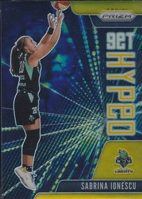 The Sabrina Ionescu 2021 Prizm WNBA #11 Get Hyped - Gold /10 card is 1 of 79 Sabrina Ionescu's card variations in the 2021 Prizm WNBA set being tracked by Sports Card Investor, including Base, Green, Green Ice, Hyper, and Ice.