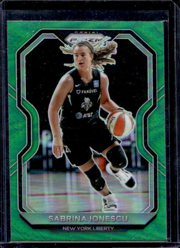 The Sabrina Ionescu 2021 Prizm WNBA #39 Green card is 1 of 79 Sabrina Ionescu's card variations in the 2021 Prizm WNBA set being tracked by Sports Card Investor, including Base, Green Ice, Hyper, Ice, and Ruby Wave.
