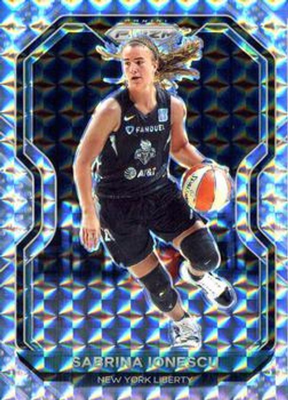 The Sabrina Ionescu 2021 Prizm WNBA #39 Mosaic /3 card is 1 of 79 Sabrina Ionescu's card variations in the 2021 Prizm WNBA set being tracked by Sports Card Investor, including Base, Green, Green Ice, Hyper, and Ice.