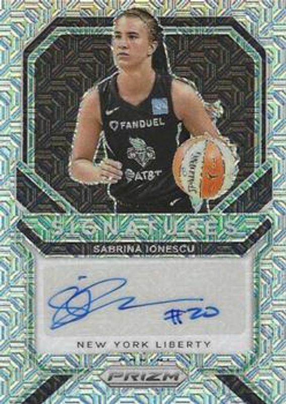 The Sabrina Ionescu 2021 Prizm WNBA #SG-SIG Signatures - Mojo /25 card is 1 of 79 Sabrina Ionescu's card variations in the 2021 Prizm WNBA set being tracked by Sports Card Investor, including Base, Green, Green Ice, Hyper, and Ice.