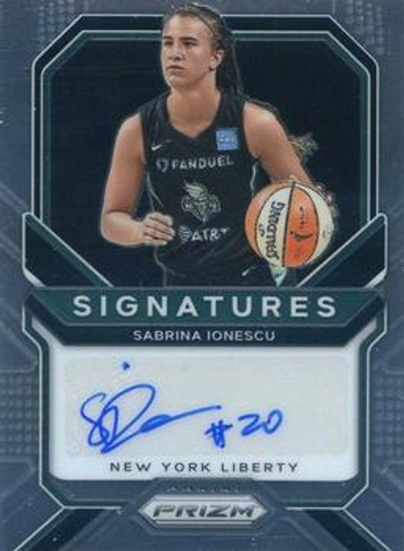 The Sabrina Ionescu 2021 Prizm WNBA #SG-SIG Signatures card is 1 of 79 Sabrina Ionescu's card variations in the 2021 Prizm WNBA set being tracked by Sports Card Investor, including Base, Green, Green Ice, Hyper, and Ice.
