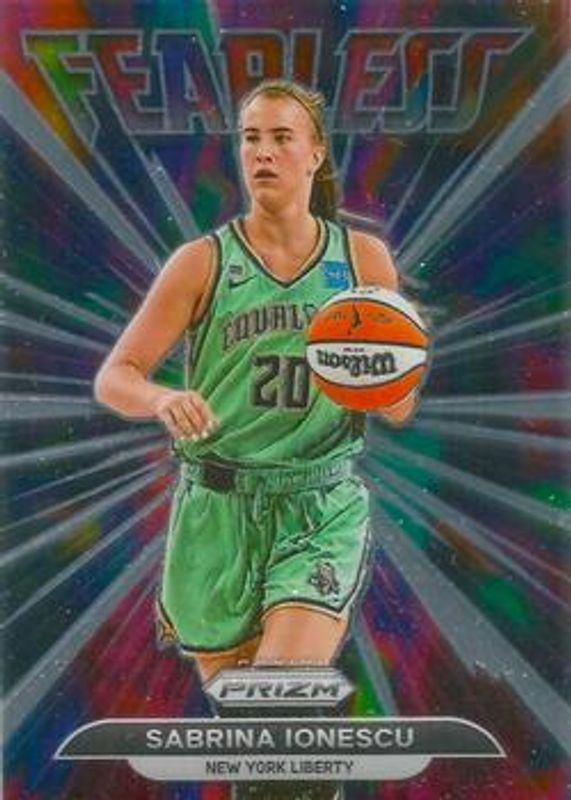 The Sabrina Ionescu 2022 Prizm WNBA #5 Fearless card is 1 of 79 Sabrina Ionescu's card variations in the 2022 Prizm WNBA set being tracked by Sports Card Investor, including Base, Green, Green Ice, Hyper, and Ice.