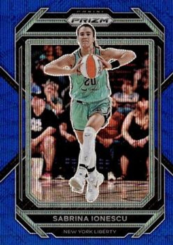 The Sabrina Ionescu 2023 Prizm WNBA #50 Blue Wave card is 1 of 40 Sabrina Ionescu's card variations in the 2023 Prizm WNBA set being tracked by Sports Card Investor, including Base, Green, Hyper, Ice, and Ruby Wave.