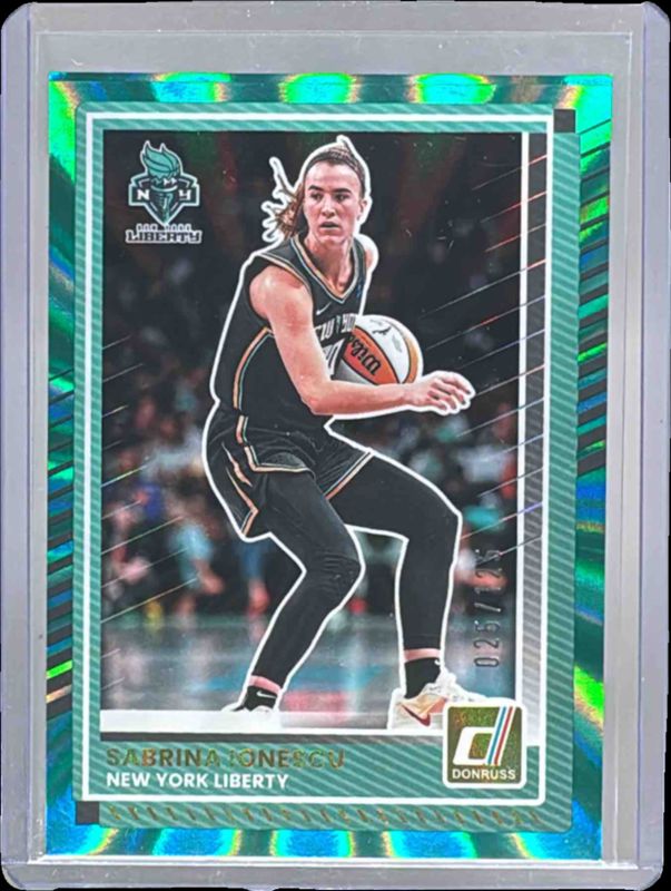 The Sabrina Ionescu 2025 Donruss WNBA #83 Teal Laser /125 card is 1 of 121 Sabrina Ionescu's card variations in the 2025 Donruss WNBA set being tracked by Sports Card Investor, including Base, Cubic, Dragon, Green Laser, and Green Shimmer.