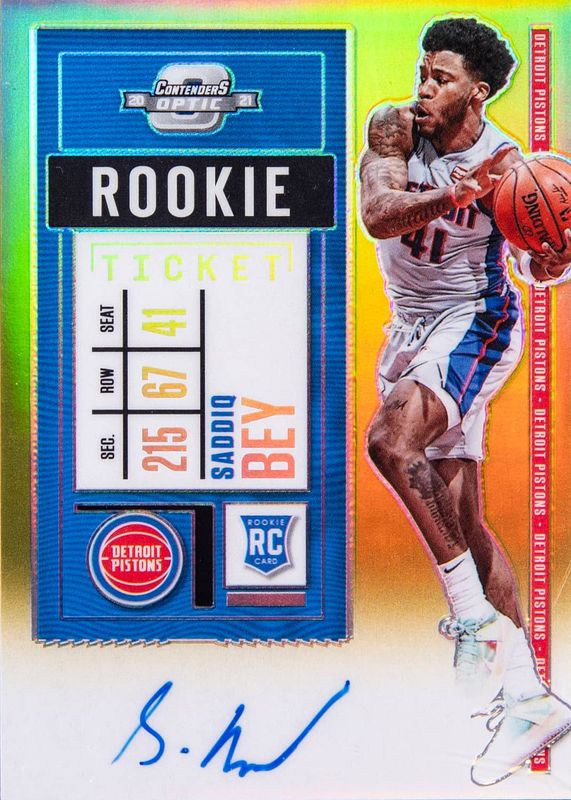 The Saddiq Bey 2020 Contenders Optic #113 Rookie Ticket Auto - Gold /10 (White Jersey) card in Raw condition has not changed in price in the last 30 days and was last sold for $100.00 .