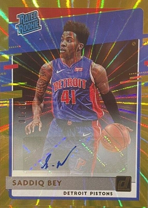 The Saddiq Bey 2020 Donruss #210 Rated Rookie Signatures - Holo Gold Laser /10 card in Raw condition has not changed in price in the last 30 days and was last sold for $72.00 .