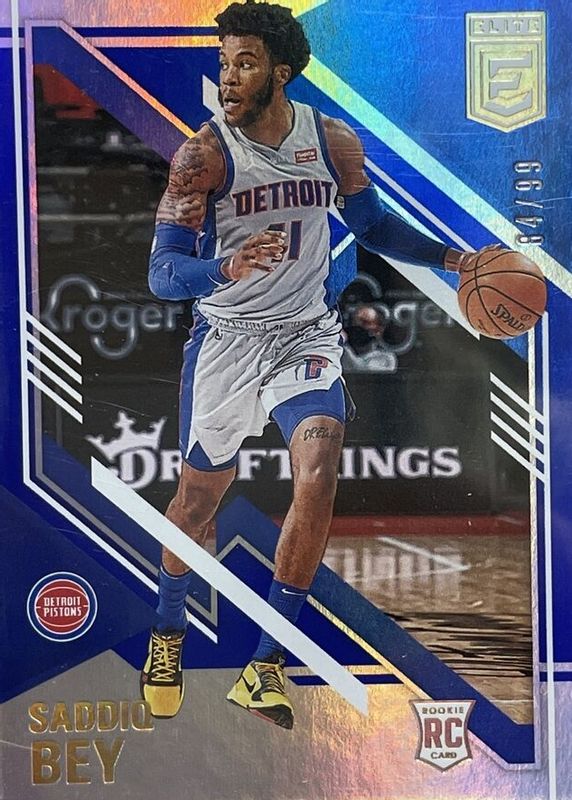 This card is 1 of 15 Saddiq Bey's card variations in the 2020 Elite set being tracked by Sports Card Investor, including Base, Base Rookie /299, Aspirations (/59), Red, and Status (/41).