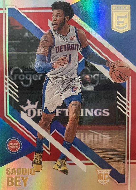 This card is 1 of 15 Saddiq Bey's card variations in the 2020 Elite set being tracked by Sports Card Investor, including Base, Base Rookie /299, Aspirations (/59), Status (/41), and Blue /99.