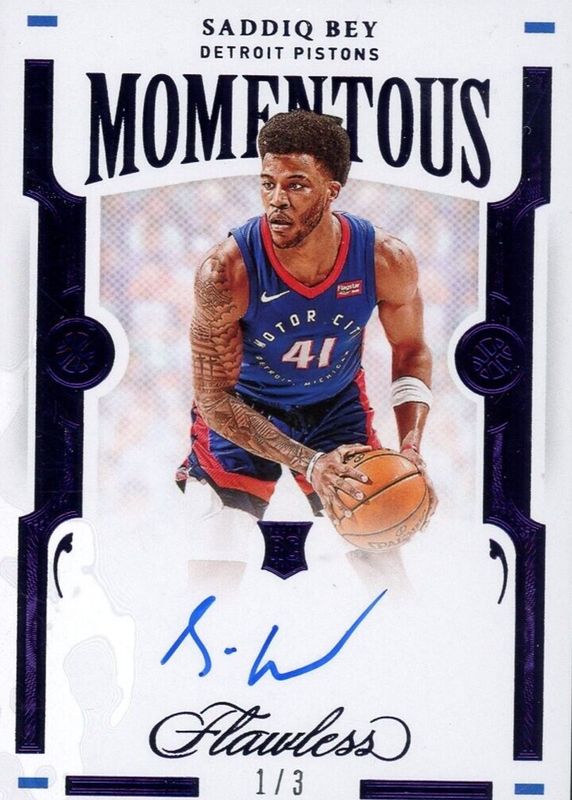 The Saddiq Bey 2020 Flawless #MOM-BEY Momentous Autographs - Amethyst /3 Rookie card in Raw condition has not changed in price in the last 30 days and was last sold for $64.00 .