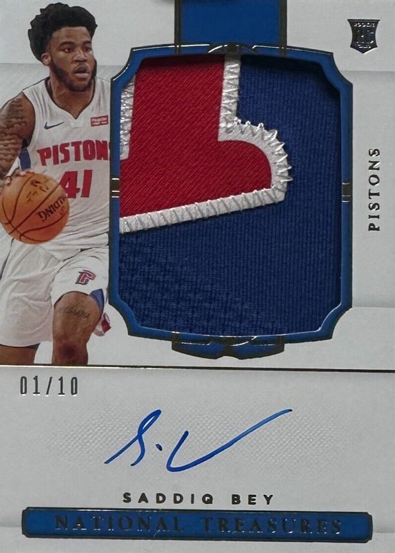 This card is 1 of 9 Saddiq Bey's card variations in the 2020 National Treasures set being tracked by Sports Card Investor, including Rookie Patch Auto /99, Rookie Patch Auto - Gold FOTL /24, Rookie Patch Auto - Purple FOTL /8, Rookie Patch Auto - Emerald /5, and Rookie Patch Auto - Blue FOTL /3.