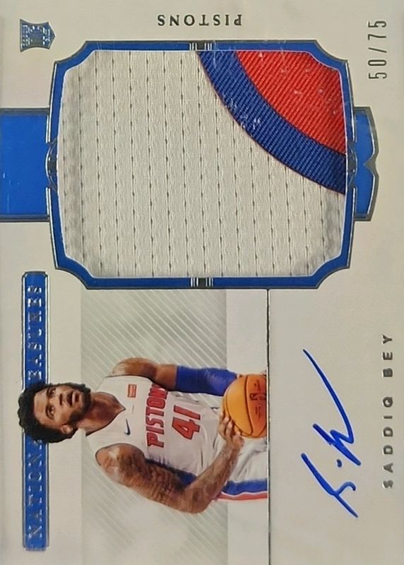 The Saddiq Bey 2020 National Treasures #123 Rookie Patch Auto Horizontal /75 card in Raw condition has not changed in price in the last 30 days and was last sold for $72.00 .
