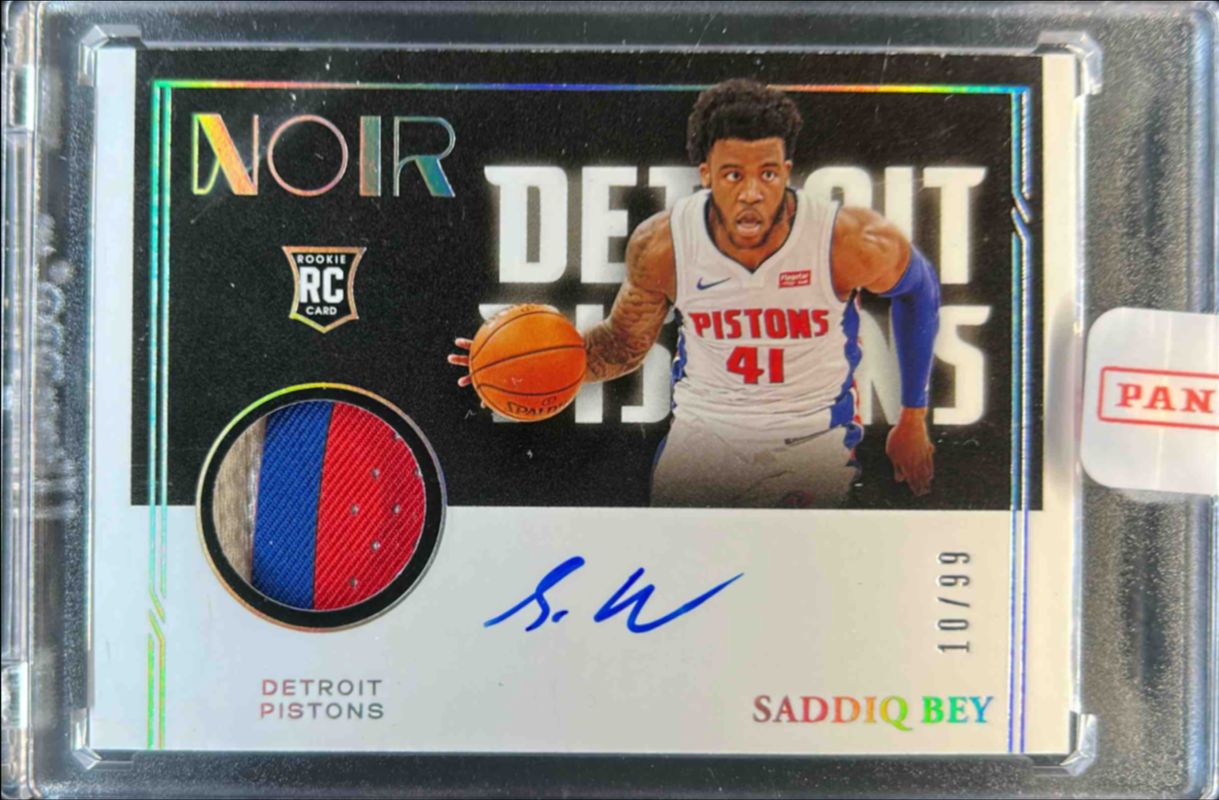 The Saddiq Bey 2020 Noir #374 Base /99 Rookie card is 1 of 28 Saddiq Bey's card variations in the 2020 Noir set being tracked by Sports Card Investor, including #334 Base /99, #162 Base /99, #192 Base /99, #162 Holo Silver /25, and #192 Holo Silver /25.