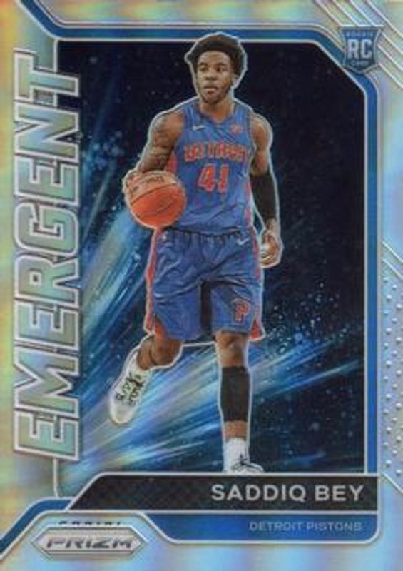 The Saddiq Bey 2020 Prizm #4 Emergent - Silver Rookie card is 1 of 76 Saddiq Bey's card variations in the 2020 Prizm set being tracked by Sports Card Investor, including Base, Choice Blue Yellow Green, Fast Break, Green, and Green Ice.