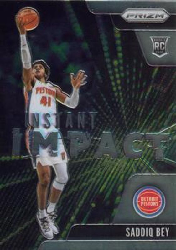 The Saddiq Bey 2020 Prizm #24 Instant Impact Rookie card is 1 of 76 Saddiq Bey's card variations in the 2020 Prizm set being tracked by Sports Card Investor, including Base, Choice Blue Yellow Green, Fast Break, Green, and Green Ice.