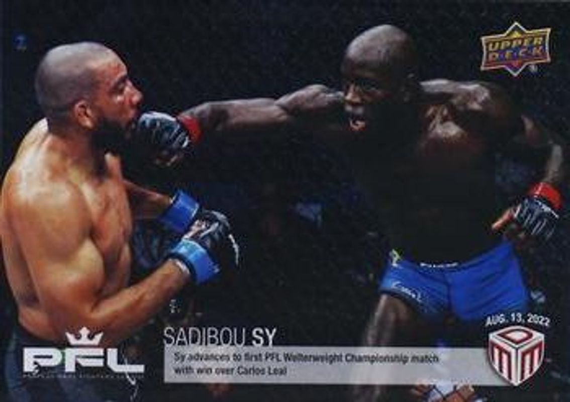 The Sadibou Sy 2022 Upper Deck PFL Match Dated Moments #32 Base card is 1 of 6 Sadibou Sy's card variations in the 2022 Upper Deck PFL Match Dated Moments set being tracked by Sports Card Investor, including #22 Base, #39 Base, #C-5 PFL Champions Achievements, #C-5 PFL Champions Achievements - Blue, and #C-5 PFL Champions Achievements - Red.
