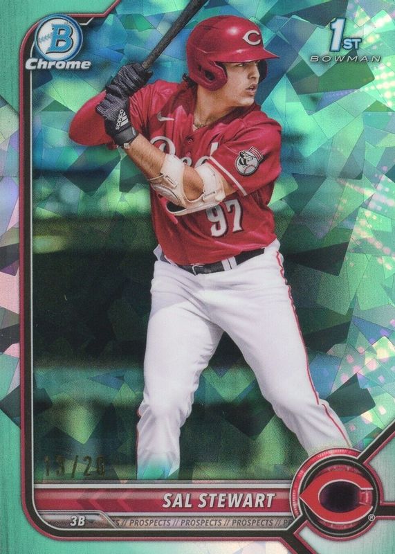 This card is 1 of 9 Sal Stewart's card variations in the 2022 Bowman Draft Sapphire Edition set being tracked by Sports Card Investor, including Chrome (1st), Chrome - Yellow /99 (1st), Chrome - Green /50 (1st), Chrome - Orange /25 (1st), and Chrome - Gold /15 (1st).