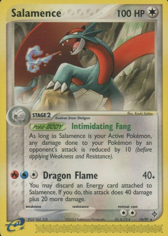 The Salamence 2003 EX: Dragon #19/97 Base card in Raw TCG (Near Mint) condition has moved up $0.74 (+32.9%) in the last 30 days and was last sold for $2.99 .