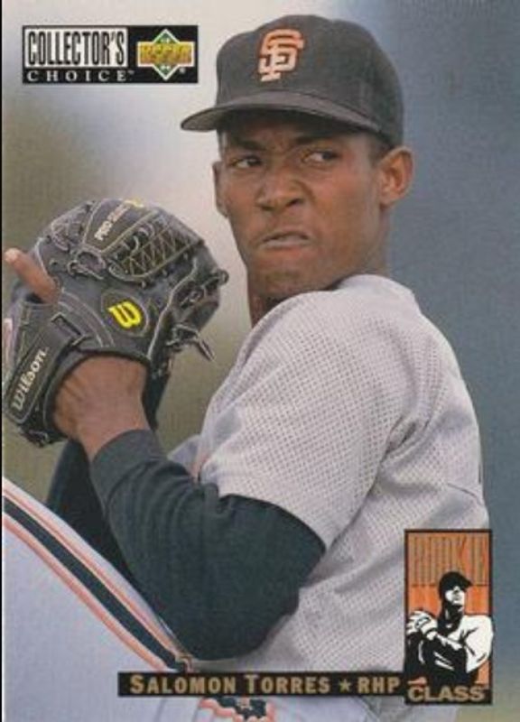 The Salomon Torres 1994 Upper Deck Collector's Choice #19 Base Rookie card is 1 of 3 Salomon Torres' card variations in the 1994 Upper Deck Collector's Choice set being tracked by Sports Card Investor, including Gold Signatures, and Silver Signatures.