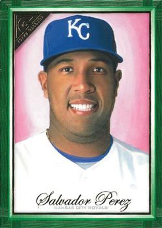 The Salvador Perez 2019 Topps Gallery #100 Green /99 card is 1 of 18 Salvador Perez's card variations in the 2019 Topps Gallery set being tracked by Sports Card Investor, including Base, Artist Proof, Wood, Private Issue /250, and Blue /50.