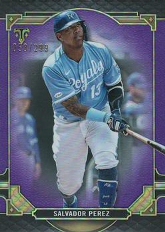 The Salvador Perez 2022 Topps Triple Threads #24 Amethyst /299 card is 1 of 87 Salvador Perez's card variations in the 2022 Topps Triple Threads set being tracked by Sports Card Investor, including Base, Emerald /259, Amber /199, Aquamarine /150, and Tourmaline /125.